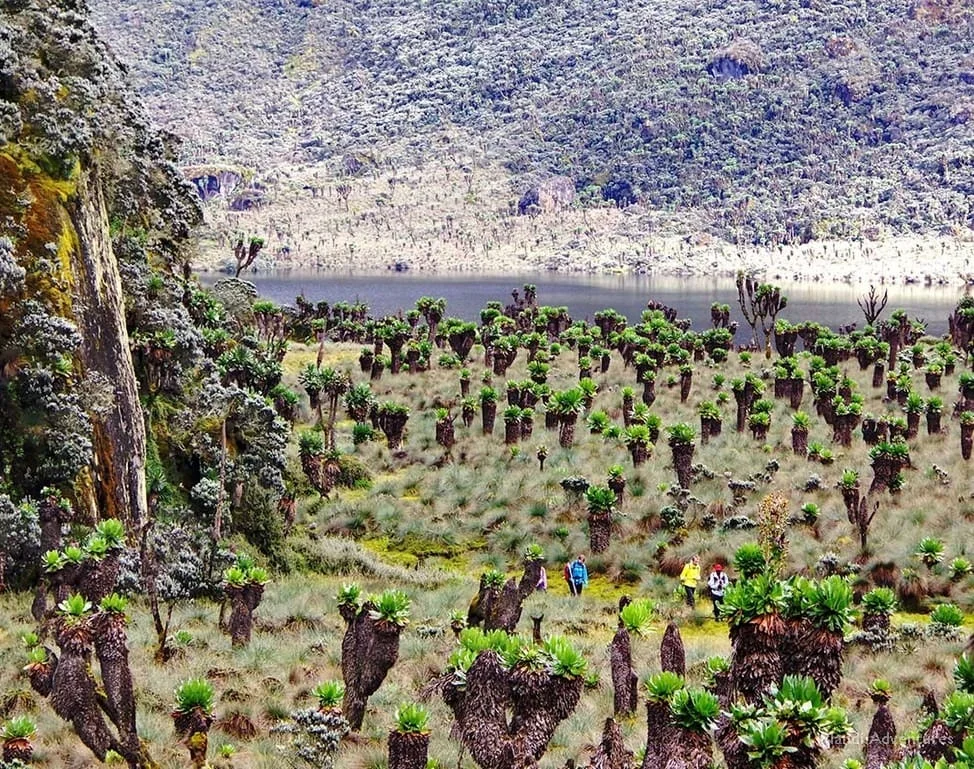 Start the day by climbing along a rocky riverbed and passing through boggy areas. You’ll reach the top of a high waterfall before descending through Hunwicks Pass. The trail leads through the Twin Peaks, where you can spot hawks, eagles, and possibly Hyrax or Red Diker. After crossing bogs and passing giant lobelias, you’ll arrive at Kiharo Camp at which is situated in a deep valley with high cliffs and dense vegetation.