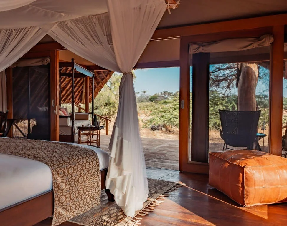 The elevated luxury safari tents, with floor-to-ceiling glass, seamlessly blend indoor comfort with nature. Each tent is thoughtfully designed with a four-poster bed, en-suite bathroom, complimentary internet, and a private veranda. The family unit offers two en-suite bedrooms separated by a private lounge, providing the perfect space to relax and reconnect.